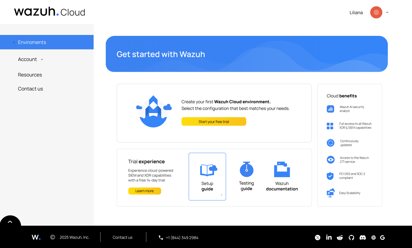 Wazuh Cloud delivers scalable, real-time security monitoring with built-in threat detection, threat intelligence, and regulatory compliance capabilities to keep your infrastructure secure. Powered by an AI security analyst, it reduces alert fatigue and manual effort, helping your team focus on the threats that matter most.